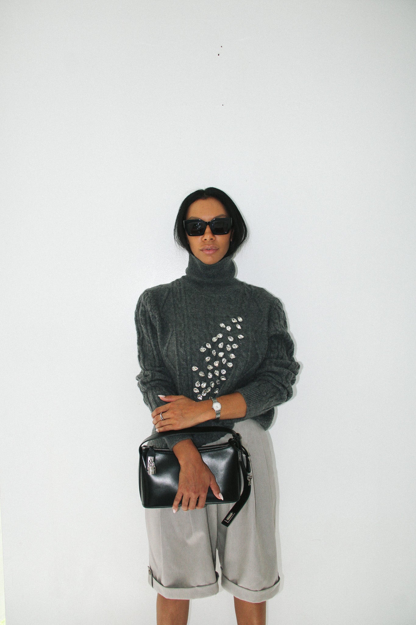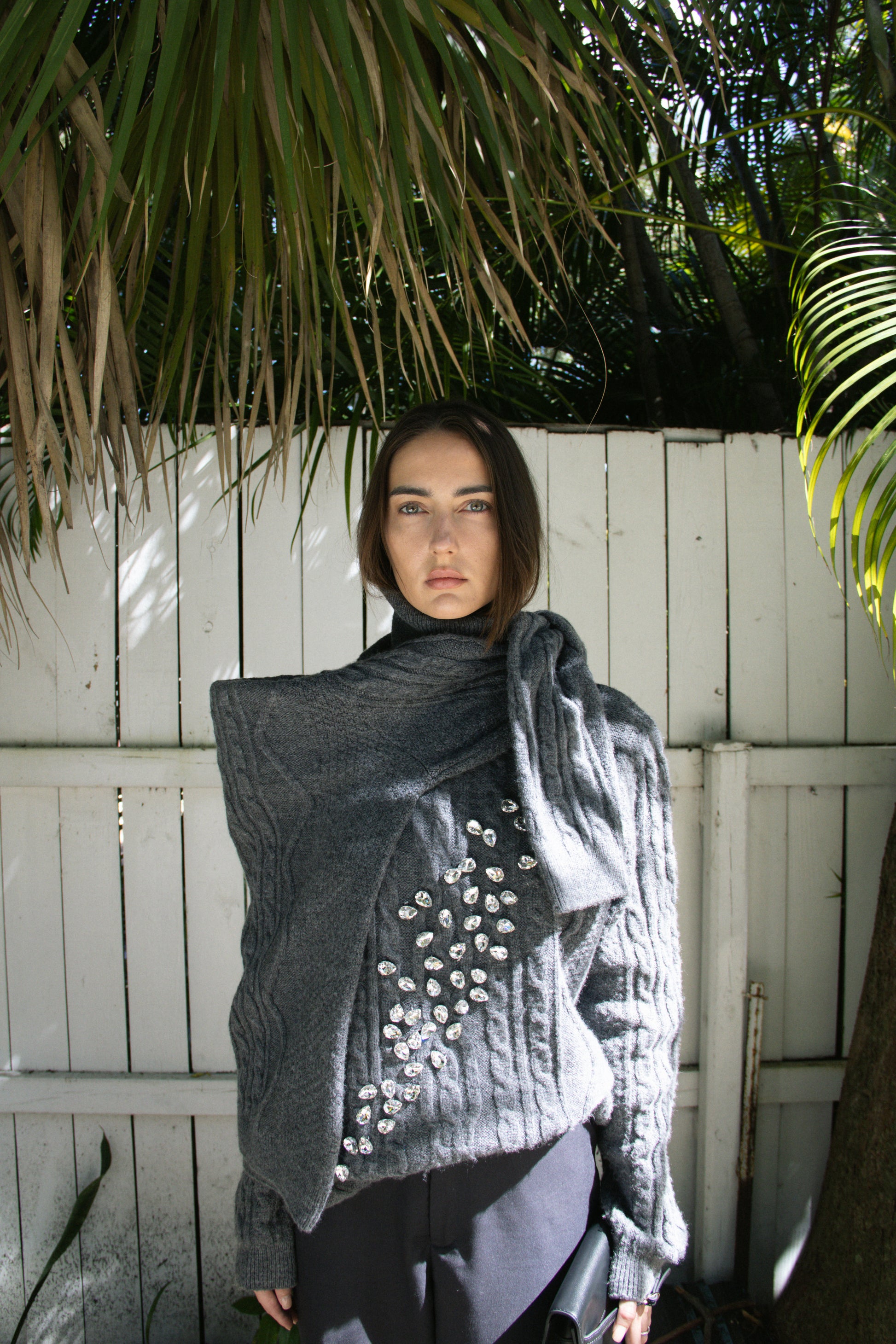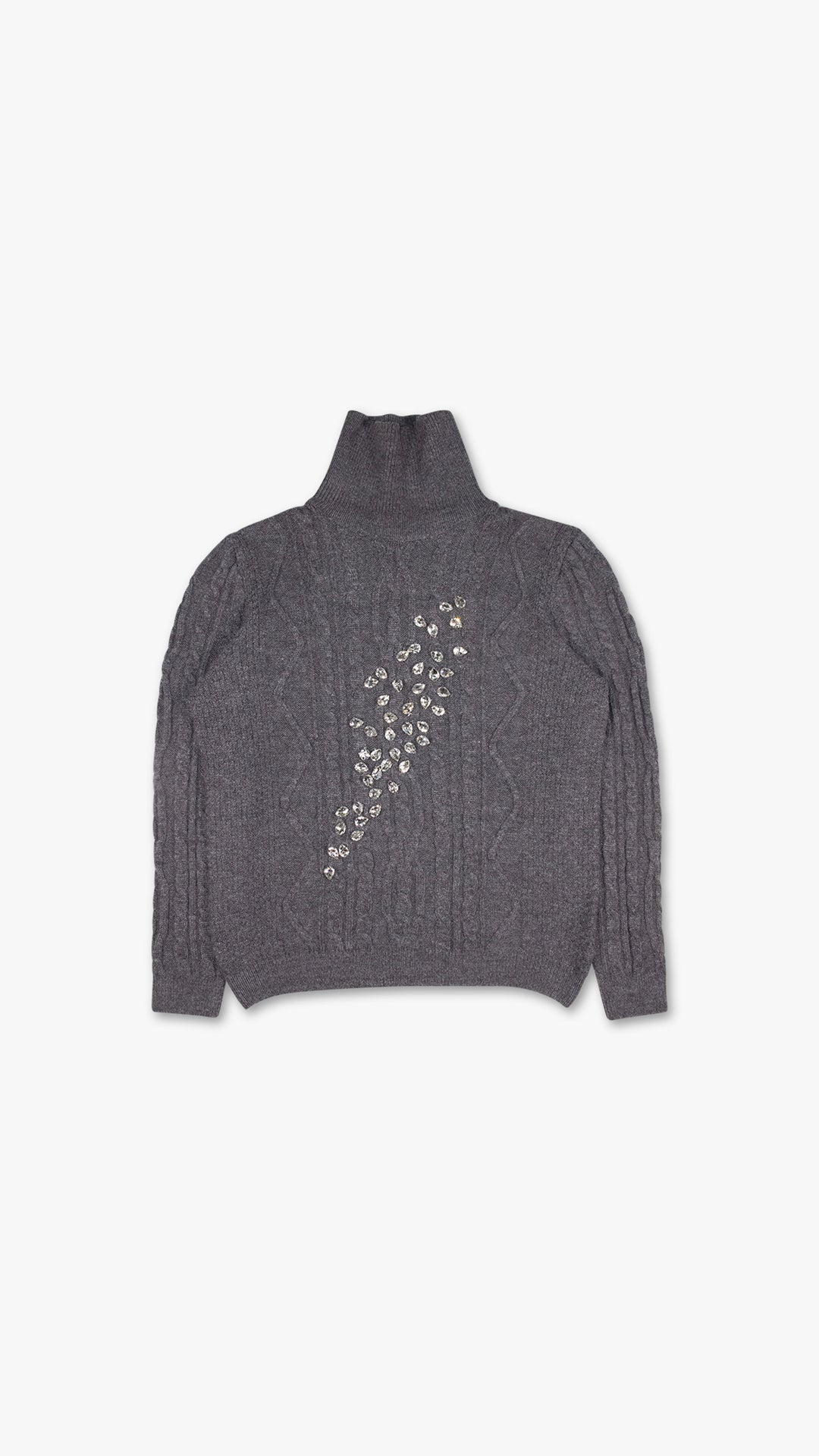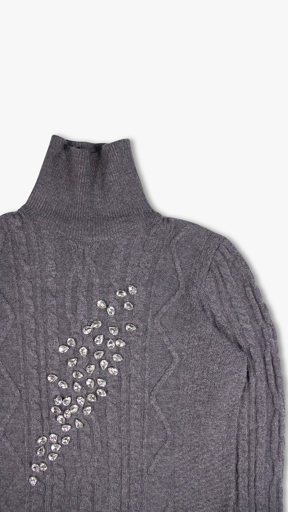 Embrace the moody sophistication of a gray, misty morning with this standout cashmere-blend sweater. Woven from 91% cashmere and 8% polyester, this piece exudes warmth and luxury. The rich gray fabric is adorned with shimmering crystal accents across the front, creating a striking interplay between classic cable rope patterns and modern, eye-catching detail.