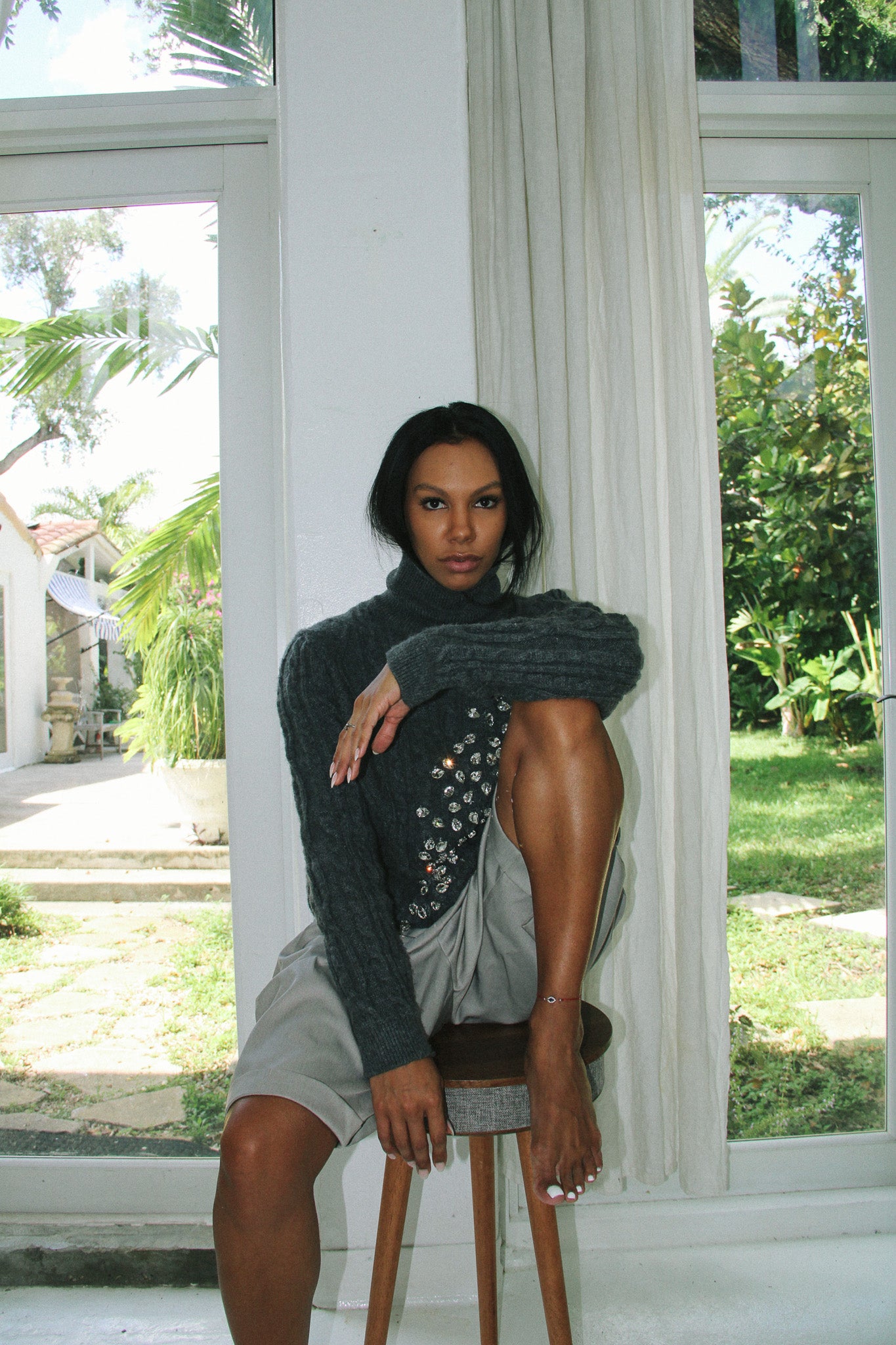Designed for those special evenings when making a statement is essential, this sweater features a bold, versatile turtleneck that can be scrunched for a relaxed look or worn traditionally for an elegant silhouette. This piece is where understated charm meets standout elegance, ready to transform any occasion into a memorable one.