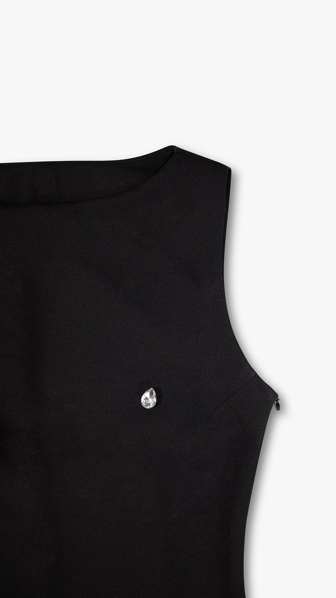 The sleek boatneck neckline and subtle side slit enhance its timeless silhouette, while a single diamond detail on the front left chest adds a distinctive touch of understated brilliance. This unique accent transforms the dress into a true statement piece.