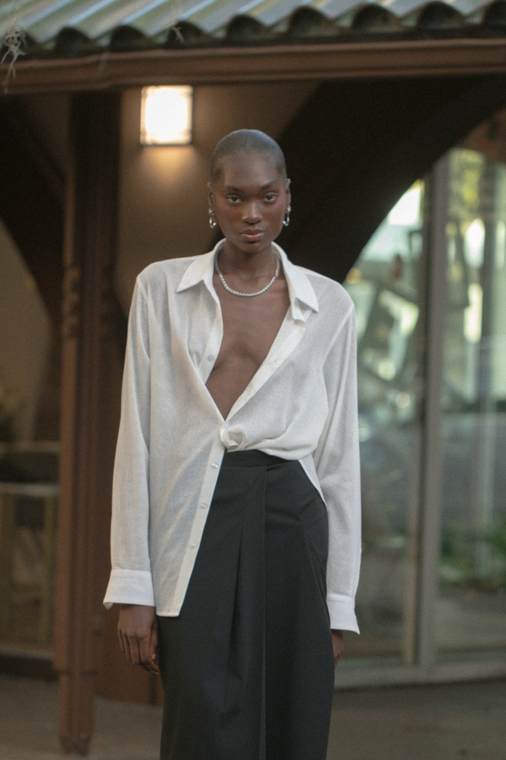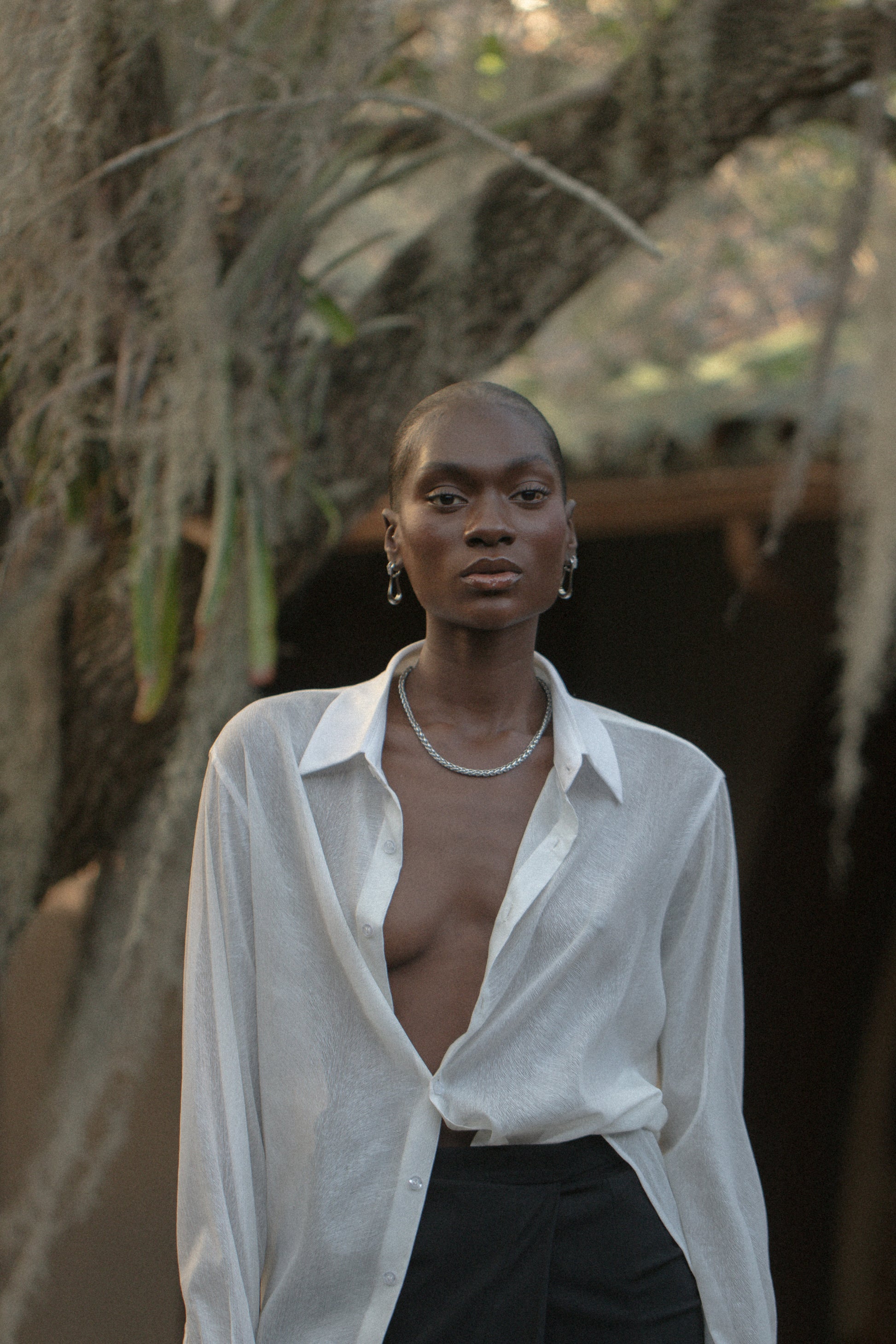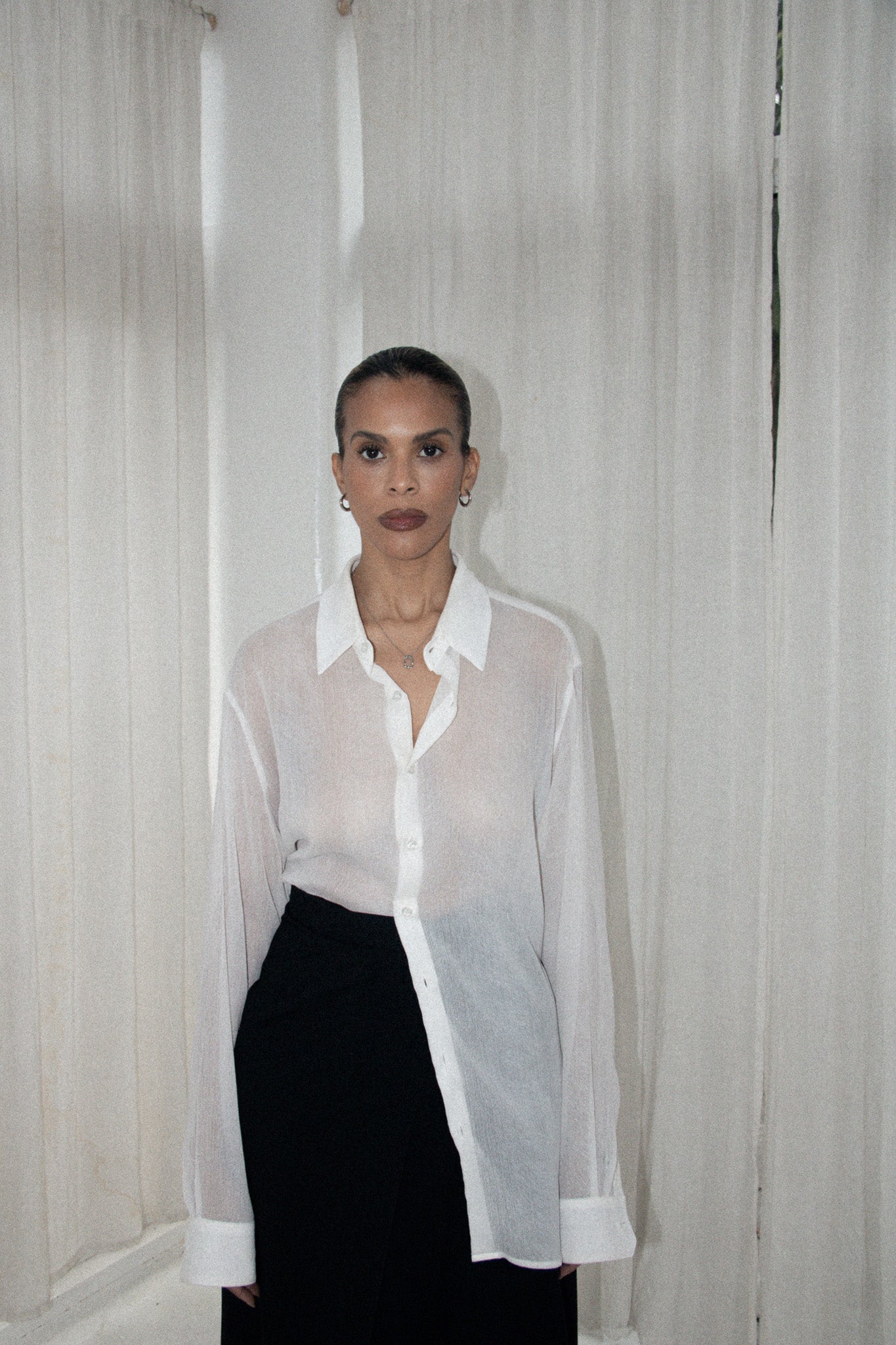 A study in refined sensuality, this sheer long-sleeve button-up offers a perfect balance between allure and discretion. Crafted from exquisite chiffon, it drapes effortlessly over the body, subtly revealing yet never exposing. The fabric is enhanced with an understated sparkling effect, catching the light with quiet opulence. Designed with a classic fit, it features the signature Gabriel Salcedo embossed collar—an emblem of meticulous craftsmanship. The double placket on the sleeves lends a structured finesse, while carefully selected buttons complete the piece with an air of understated luxury. A modern wardrobe essential, this piece is as effortless as it is striking, embodying the quiet power of sophistication.